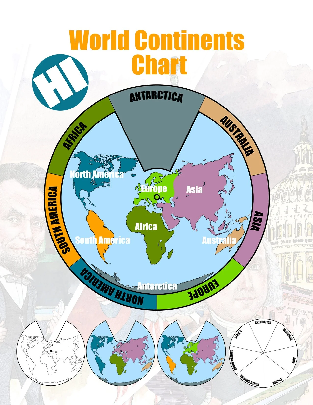 A hand-drawn spinning continent wheel — cut out all 7 continents, connect them to a rotating cover with a brad, and reveal one at a time to explore each continent's facts and features. Free to download and print.
